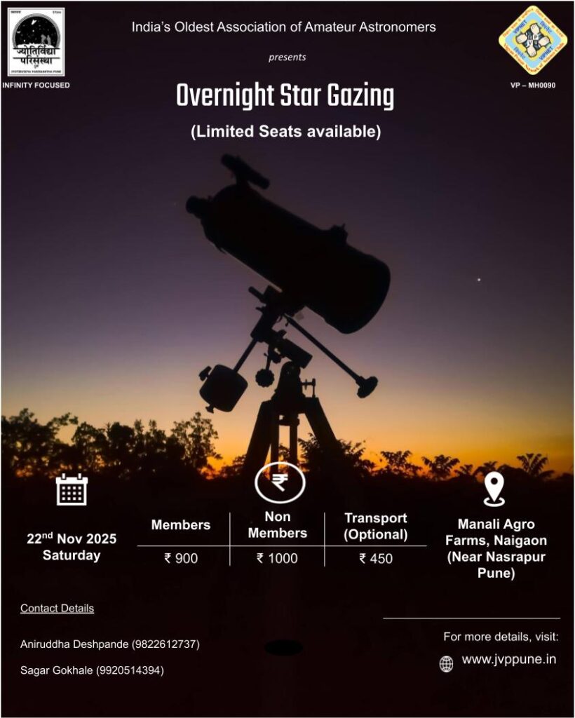 Overnight Stargazing Session which is usually arranged on a Saturday close to New Moon every month, just 40 km away from Pune at Manali Agro Farms, Naigaon, Near Nasrapur.